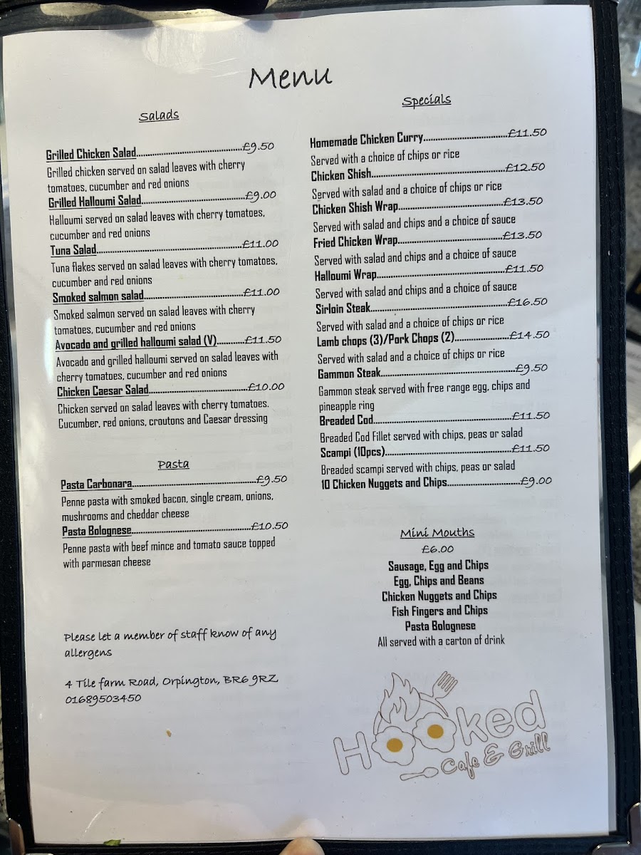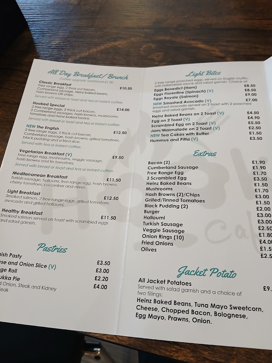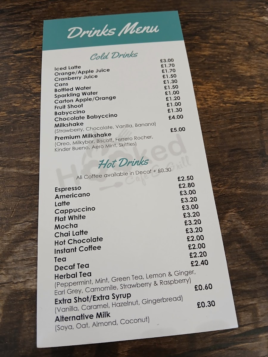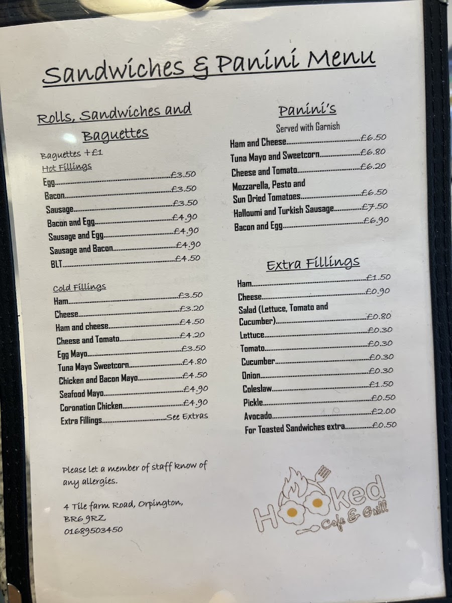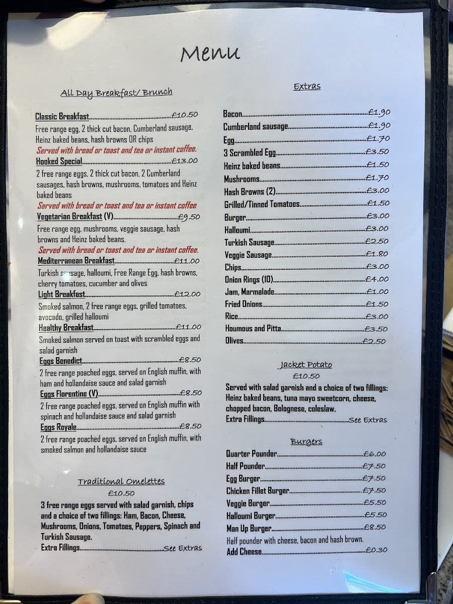 The menu at Hooked Café & Grill is structured to cater to a variety of tastes throughout the day, including breakfast, light meals, and casual dining options. It offers a selection of hot and cold dishes, alongside extras and fillings designed for quick service or relaxed meals.